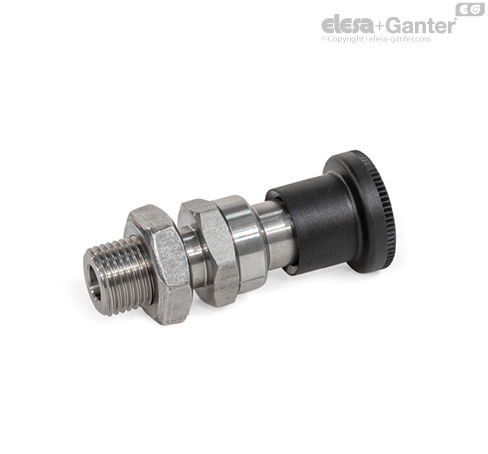 分度销 GN 824 具有方形横截面的柱塞销、在一侧上的闩锁表面和在另一侧上的倒角。 当要固定的物体朝着斜面移动时,柱塞销被推回导向器,使凹槽和边缘穿过销。 当向着锁定表面移动时,销会自动锁入位置。 拉动旋钮可以松开闩锁。