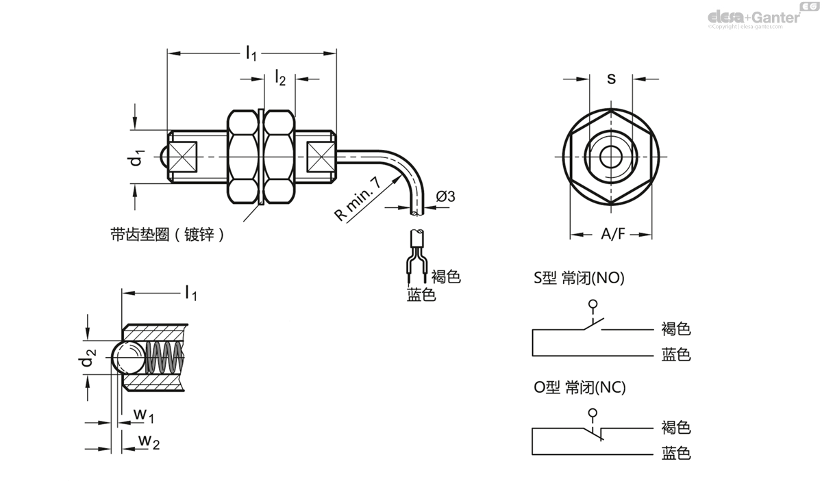 型号 | d1±0.05 | d1 | d2 | l1 | l2 | s | A/F | w1 ±0.1 ||Switching_stroke|| | w2 ±0.1 压缩 | 弹簧负载 N ≈ 起始位置 | 弹簧负载 N ≈ 终止位置 | 定位孔 | |||||