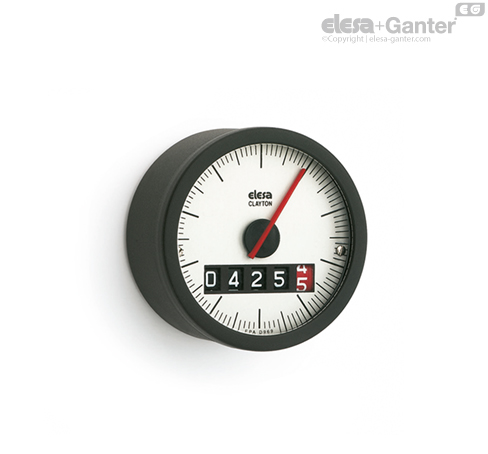 五位数式滚筒计数器和一个红色滚动带在刻度盘上。红色滚动带上的数字表示小数十分之一,指针指示百分之一。