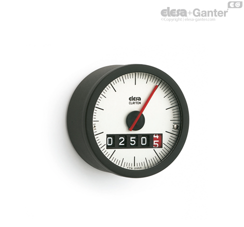 五位数式滚筒计数器和一个红色滚动带在刻度盘上。红色滚动带上的数字表示小数十分之一,指针指示百分之一。