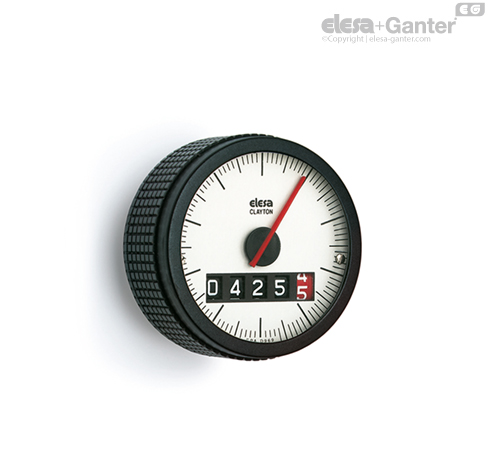五位数式滚筒计数器和一个红色滚动带在刻度盘上。红色滚动带上的数字表示小数十分之一,指针指示百分之一。