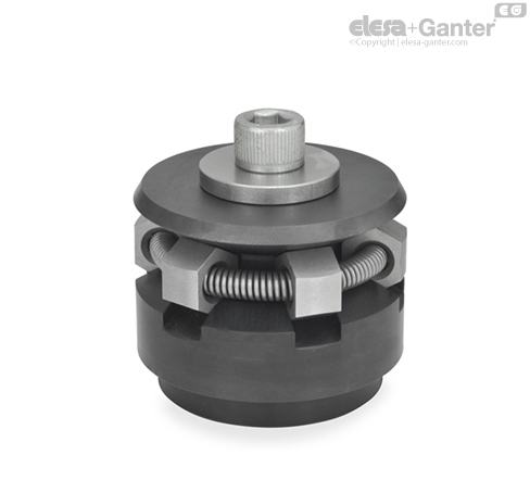 通过圆形滚珠罩内包含有 3 颗或 6 颗滚珠,该滚珠罩通过一颗螺钉,在精确导向锥体上向外移动,所述螺钉通过所施加的推力,使圆形滚珠罩的外径增大。 由此可使定心夹具与工件孔形成稳固接触。