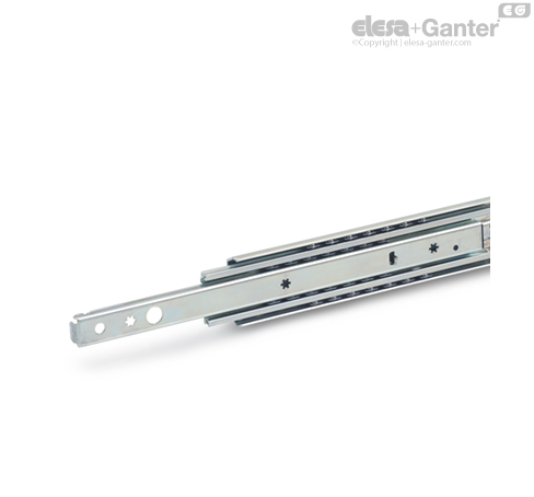 套叠式滑轨以成对方式交付。 由于结构原因,滑轨可无区分的安装在移动件的左侧或右侧。 可通过辅助孔轻易到达所有的安装孔。 仅露出安装孔,与生产相关的孔也会呈现。