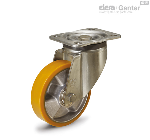 黄色镀锌钢板支架。该支架设计用于在承载高达7500 N的载荷时,保持脚轮正常的机械运动性能,使之适用于重型工业场合。