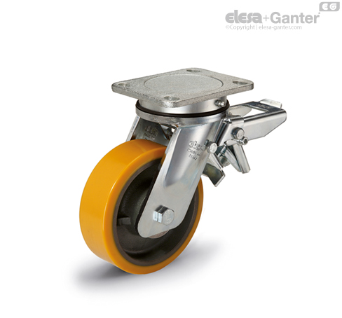 适用于重型工业场合以及严苛的工况,如侧方冲击和高速运动。注模聚氨酯脚轮滚动阻力出色、弹性佳,耐磨性及抗撕裂性高。 更详细信息参见 RE.F4.
