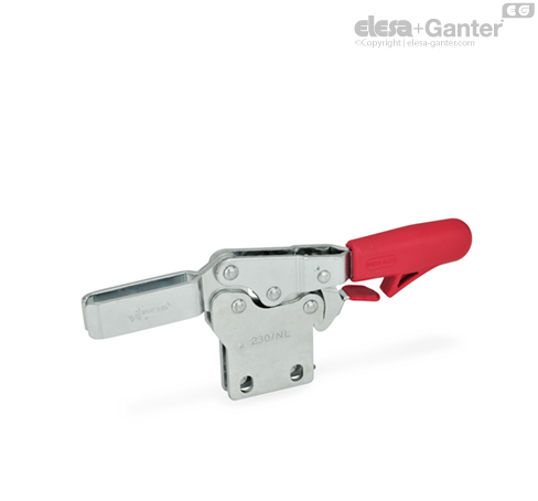 GN 820.4铰接夹具有安全功能,在夹紧期间,带预载弹簧的钩形安全闩锁能保证锁定连接。 防止由于振动或意外误操做引起的松开或打开。要打开和释放夹具,向上拉动手柄以松开钩形安全闩锁机构(单手操作)。