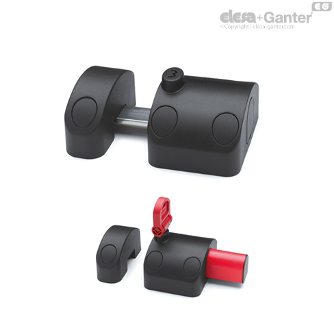 - 锁紧:按住锁紧按钮,直至其红色部分完全嵌入螺栓本体和装置夹。确保在锁紧操作过程中未插入钥匙。